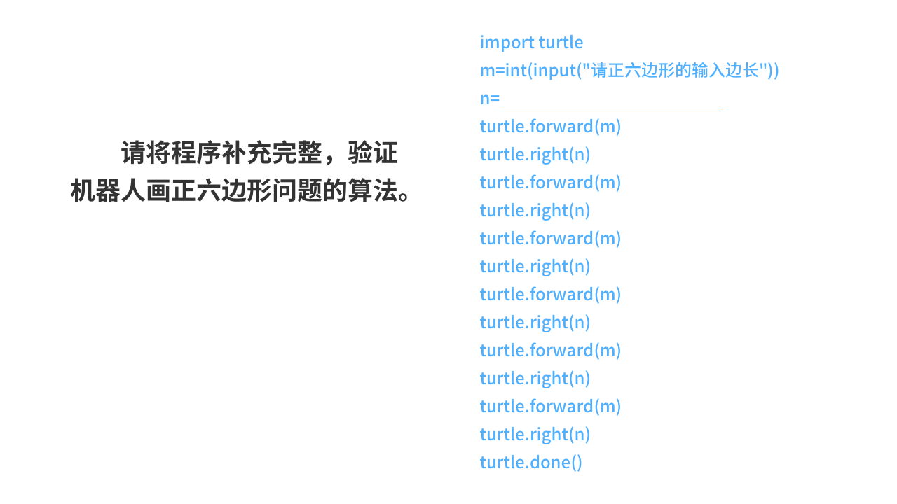 import turtle m=int(input("请正六边形的输入边长")) n= turtle.forward(m) turtle.right(n) turtle.forward(m) turtle.right(n) turtle.forward(m) turtle.right(n) turtle.forward(m) turtle.right(n) turtle.forward(m) turtle.right(n) turtle.forward(m) turtle.right(n) turtle.done()