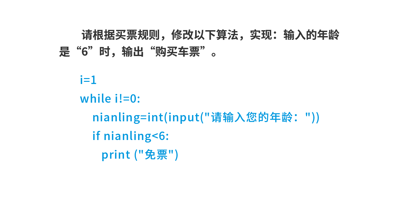 i=1 while i!=0: nianling=int(input("请输入您的年龄:")) if nianling<6: print ("买票")
